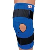 Opens flat for easy application over tender knees. Excellent support and medial-lateral stability; hinged bars include flexion and hyperextension stops; upper and lower hook and loop encircling straps are adjustable and removable.